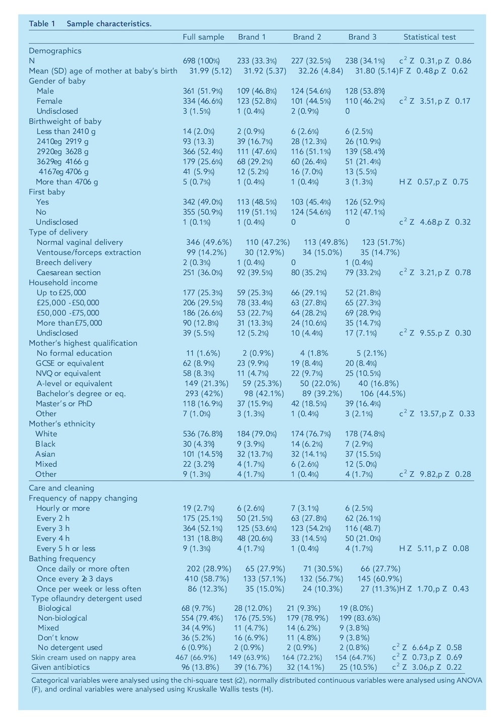 Table 1 shows the demographic characteristics and details of childcare and hygiene routines for the population analyzed and for each group. The average age of the mothers at the birth of their babies was 32.0 years (SD Z 5.12), and slightly more than half (51.9%) of the babies were male. Slightly less than half (49.0%) of the babies were their mothers' first child, and slightly less than half (49.6%) were born via normal vaginal delivery. Ethnicity was determined using UK government census classifications; 75% of the mothers in this sample self-identified as White, 15% as Asian, 5% as Black, 3% as mixed race, and 1% as another ethnic group. Comparison with population data for Greater Manchester17 showed that there was a higher proportion of people from ethnic minorities in the sample (23.3%), compared to the general population (16.4%; χ²Z25,36,p<0.001). This may be due to differences in age ranges: census data include people of all ages, whereas our sample consisted only of women of childbearing age.
