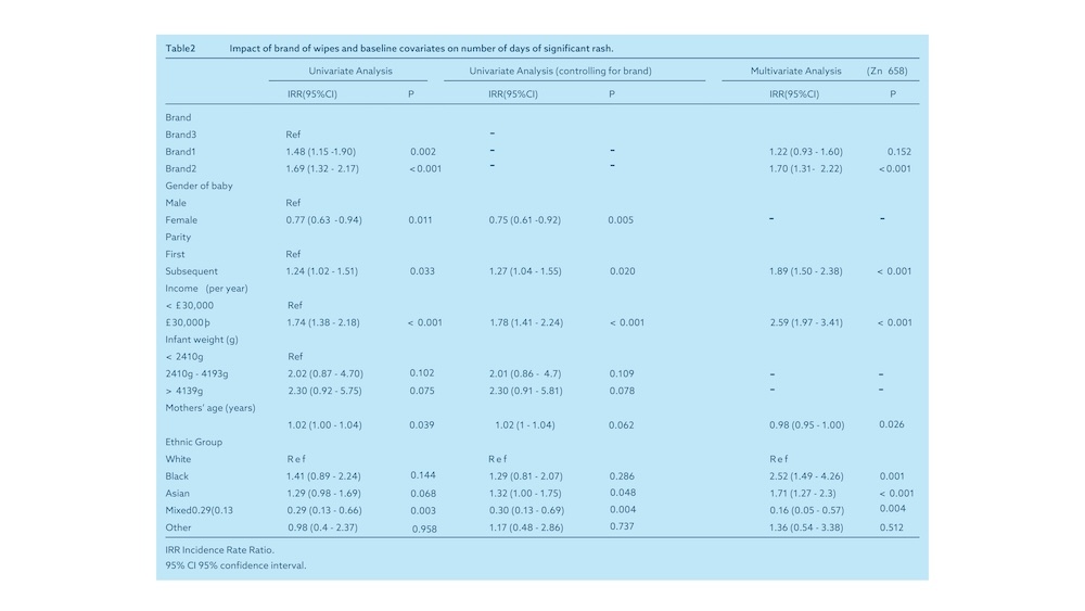 A second set of models tested each covariate separately, controlling for brand. Infant sex, parity, and household income remained significant. A multivariate forward stepwise regression model yielded similar results for the main analysis. Wipe brand remained a significant predictor of the number of days of rash, with Brand 2 use having a significantly higher rash rate (IRR 1.70, 95% CI 1.31–2.22, p < 0.001) compared with Brand 3. Although Brand 1 also had a higher rash rate compared with Brand 3, this was no longer statistically significant (IRR 1.22, 95% CI 0.93–1.60, p < 0.152). Compared with first babies, later babies had a higher rate of rash (IRR 1.89, 95% CI: 1.50-2.38, p < 0.001) and those with above-average family income also had a higher rate of IDD (IRR 2.59, 95% CI: 1.97-3.41).